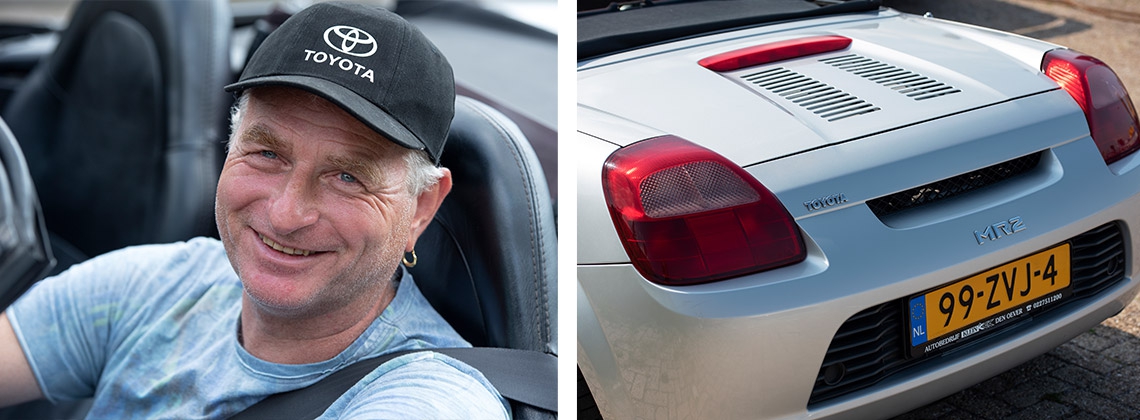 Vader Henk is de eigenaar van de Toyota MR2. “Hij zit midden in zijn midlifecrisis”, grapt Bart. “Het is vooral dat ik geen saaie auto’s meer wil rijden”, nuanceert Henk. “Op een mooie zaterdagavond dacht ik: ik wil open kunnen rijden. Binnen een uur had ik online al twee op het oog goede MR2’s gevonden en de zondag erop zijn Bart en ik gaan kijken. En deze is het geworden”, zegt Henk terwijl hij naar zijn zilverkleurige MR2 wijst. “Import uit Duitsland met nu 180.000 kilometer op de teller.”