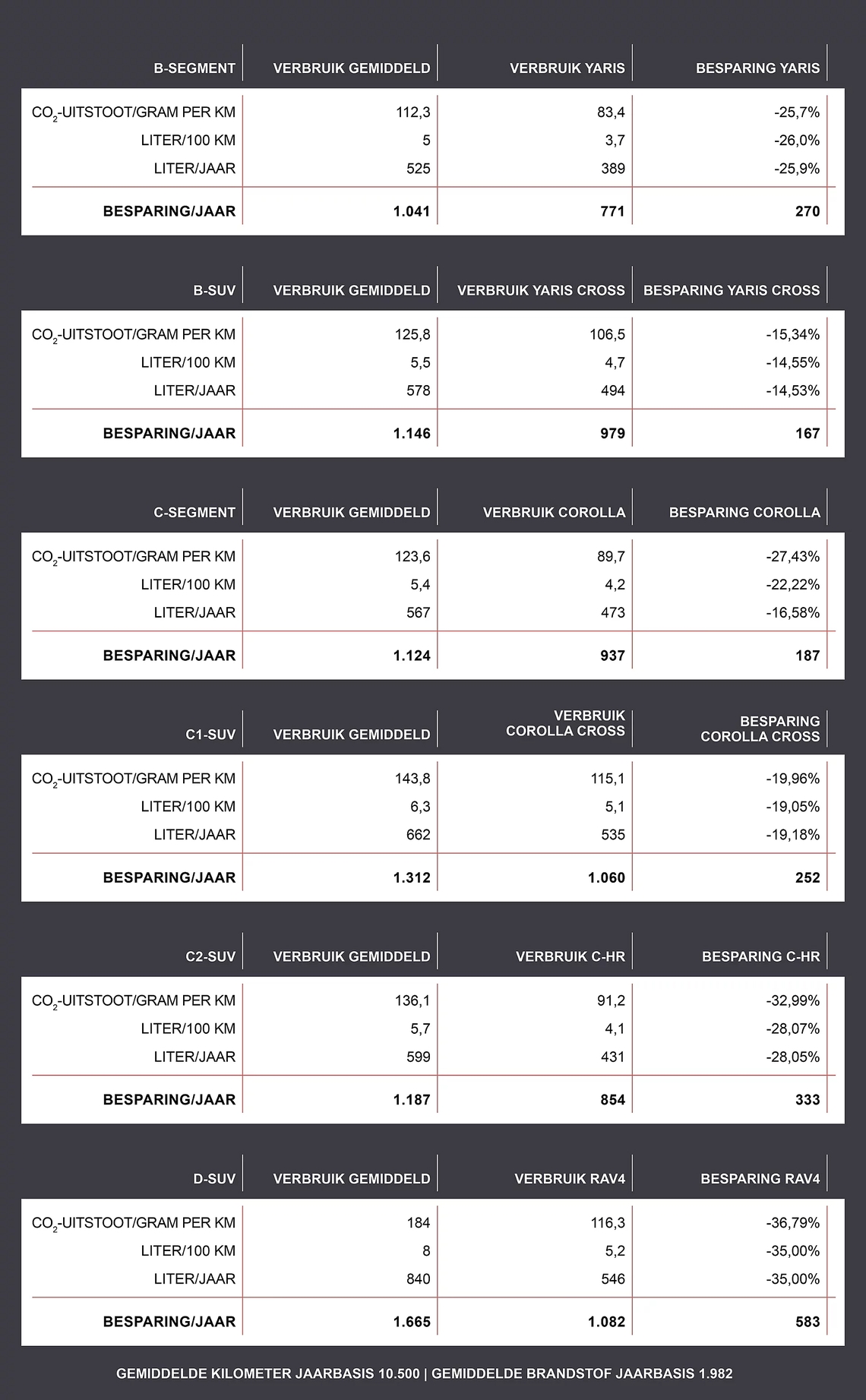 De vergelijking is gebaseerd op basis van onafhankelijk onderzoek uitgevoerd door JATO Dynamics BV (2023). Hierin worden de uitstoot- en verbruikscijfers van een Toyota Hybrid vergeleken met de gemiddeldes uit het desbetreffende segment van voertuigen met een conventionele benzinemotor. In de berekening bedraagt de brandstofprijs € 1,982. (www.unitedconsumers.com, peildatum 14-06-2023). Het jaarkilometrage bedraagt 10.500 (CBS, 2021).