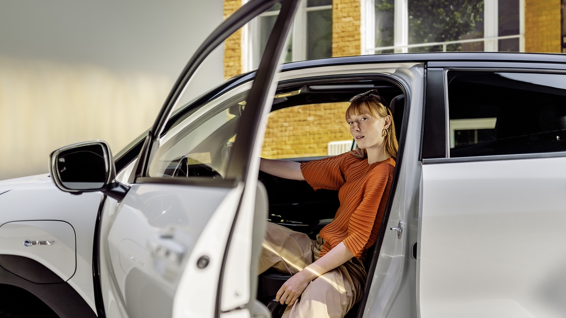 Toyota-Urban-Cruiser-interieur-vrouw-zittend-achter-stuur-met-benen-buiten-de-deur